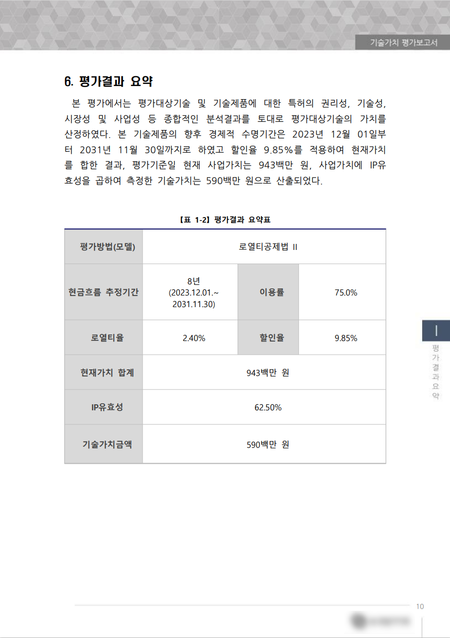 ▪ 특허기술가치평가 | 특허청 지정 평가기관을 통해 해당 특허에 대한 특허기술가치평가를 실시, 약 6억원을 평가받음