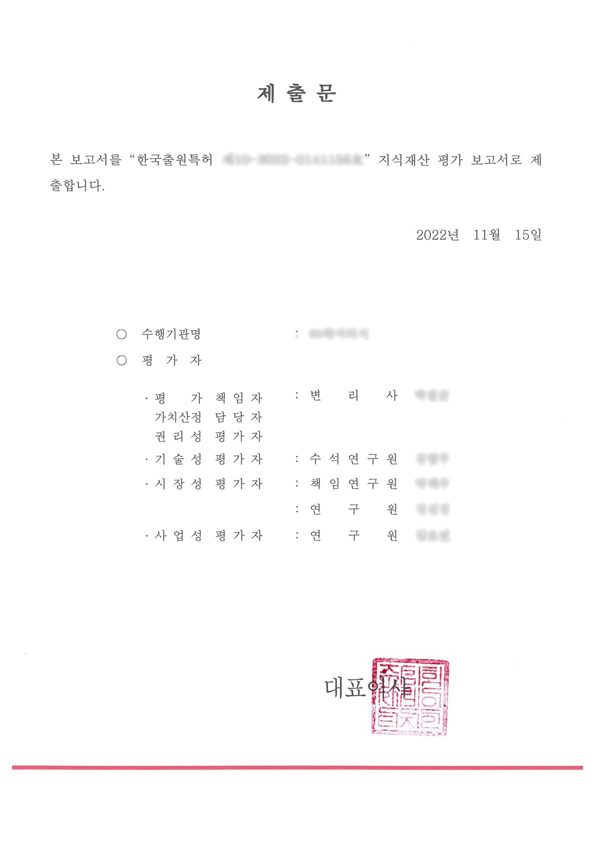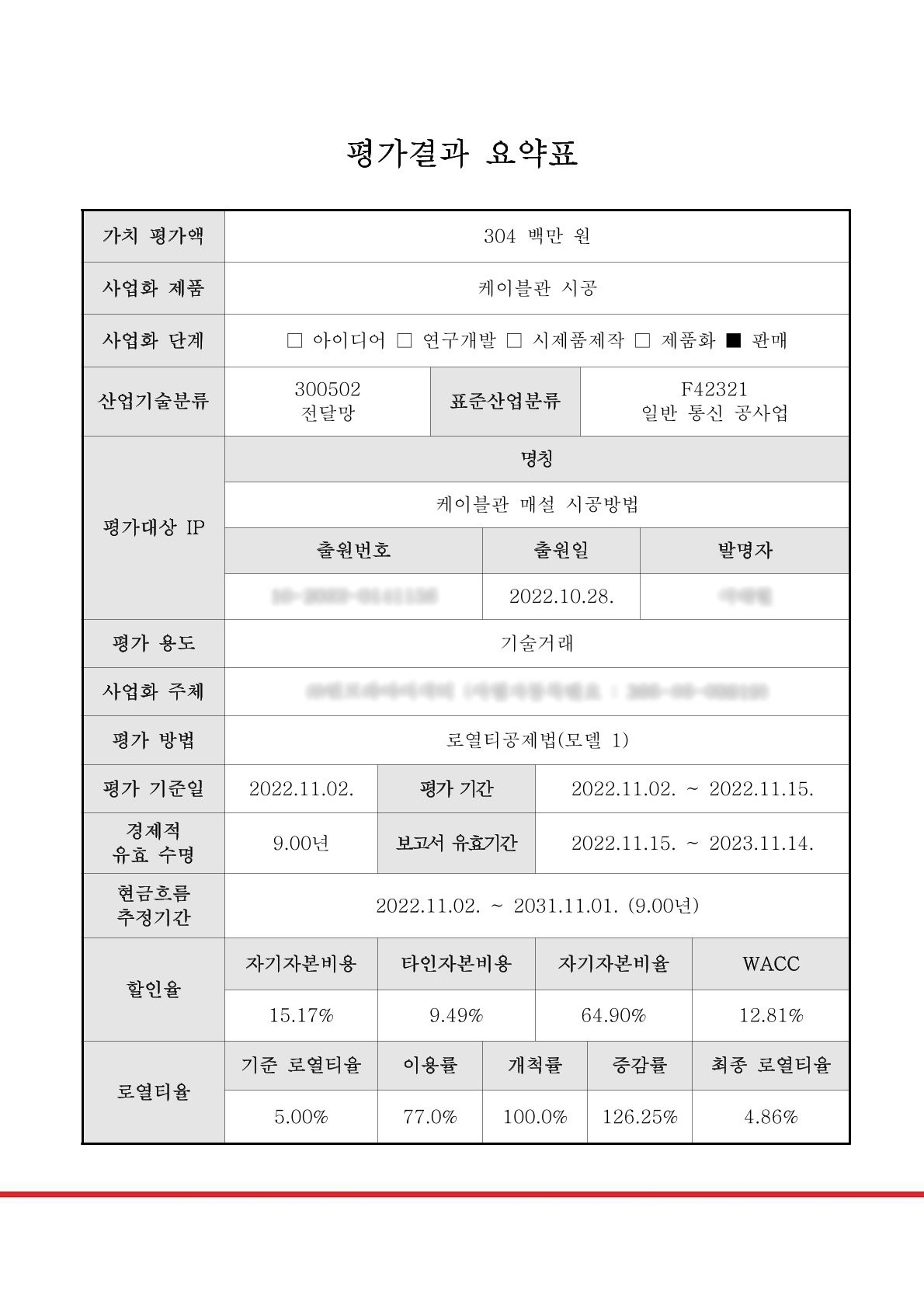 ▪ 특허기술가치평가 | 특허청 지정 평가기관을 통해 해당 특허에 대한 특허기술가치평가를 실시, 3.03억원을 평가받음
