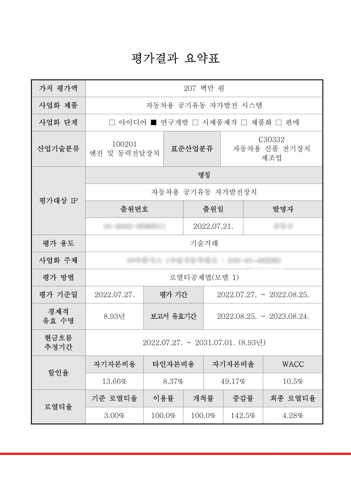 ▪ 결론 | 주식회사 ****은 특허마이닝 서비스를 통해 특허출원 1건을 진행하고, 해당 특허를 특허기술가치평가하여 2.03억원의 평가금액을 산정받아, 자본금 증자를 통한 부채비율 조정을 해결한 사례